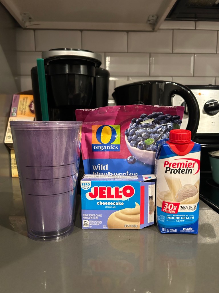 For this recipe a blender will be needed. First, shake your premier protein shake and put it into the blender. Then add the blueberries, followed by the cheesecake jell-o. Once all in the blender, blend it all together. This next part is all about preference. If you want to thicken the drink, add some ice cubes and blend. I sometimes add ice cubes to thicken it up so it has more of a smoothie consistency.