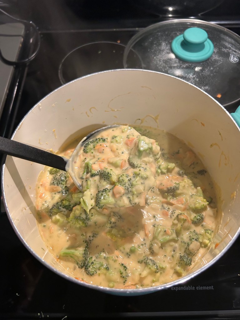 Once, everything but the cheese is in, add the cheese and mix it into the soup. I left my soup on the heat and mixed for a few extra minutes to give enough time for the vegetables to soften. (Personally, I diced the broccoli so it would cook faster. This also allowed it to soften to my preferred liking).After this is done, you can serve the soup and enjoy!